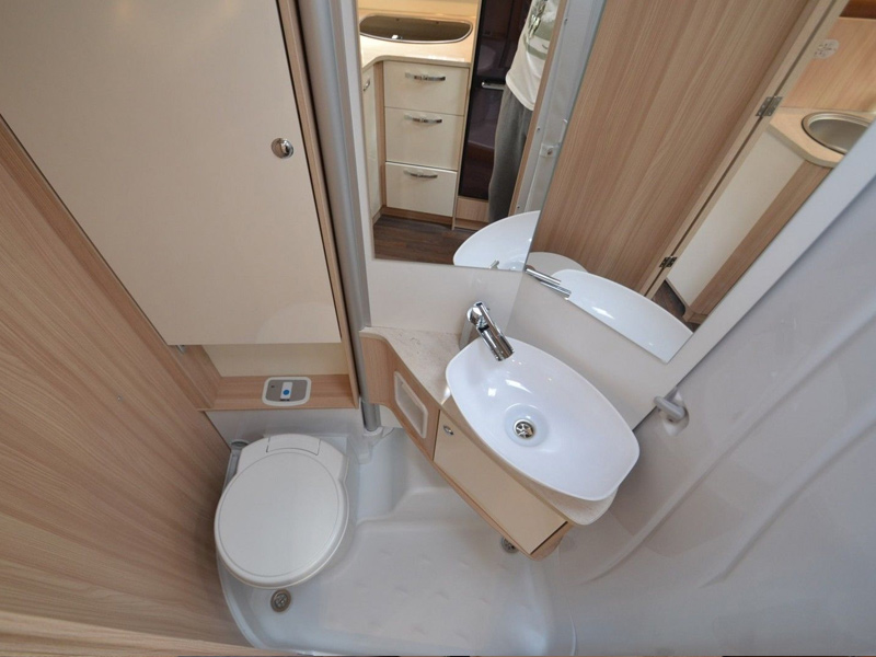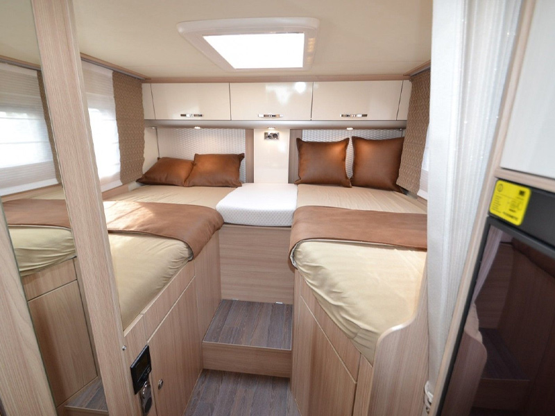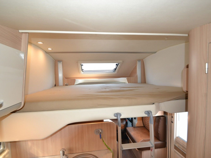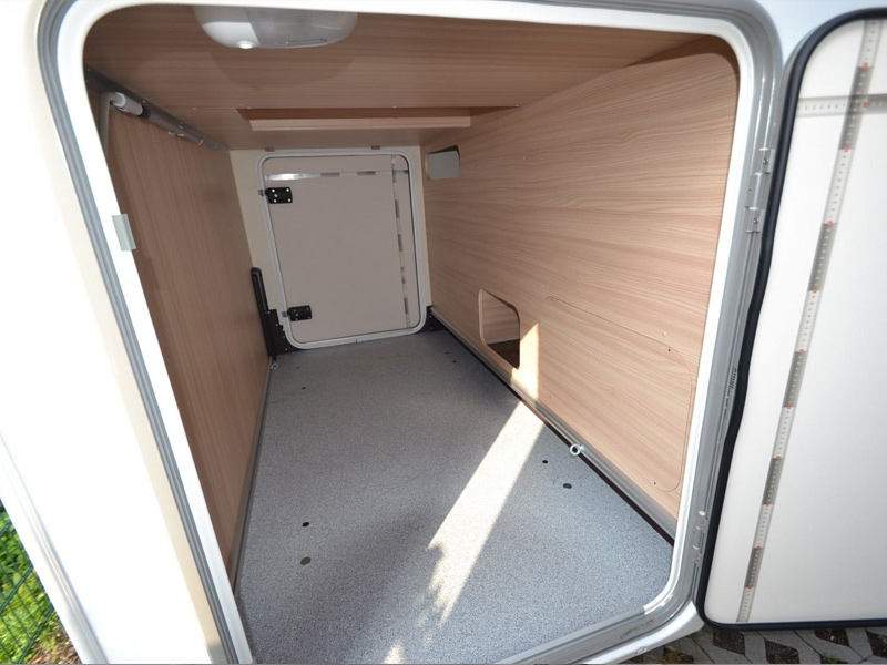 Bogato wyposażone wnętrze oferuje m.in. 145 l lodówkę z zamrażalnikiem, kuchenkę gazową, podwójne łóżko małżeńskie oraz dwuosobowe łóżko opuszczane z sufitu, łazienkę z oddzielnym prysznicem oraz ogrzewanie gazowe Truma Combi 6, TV, radio z kamerą cofania oraz szeroką markizę na zewnątrz.
