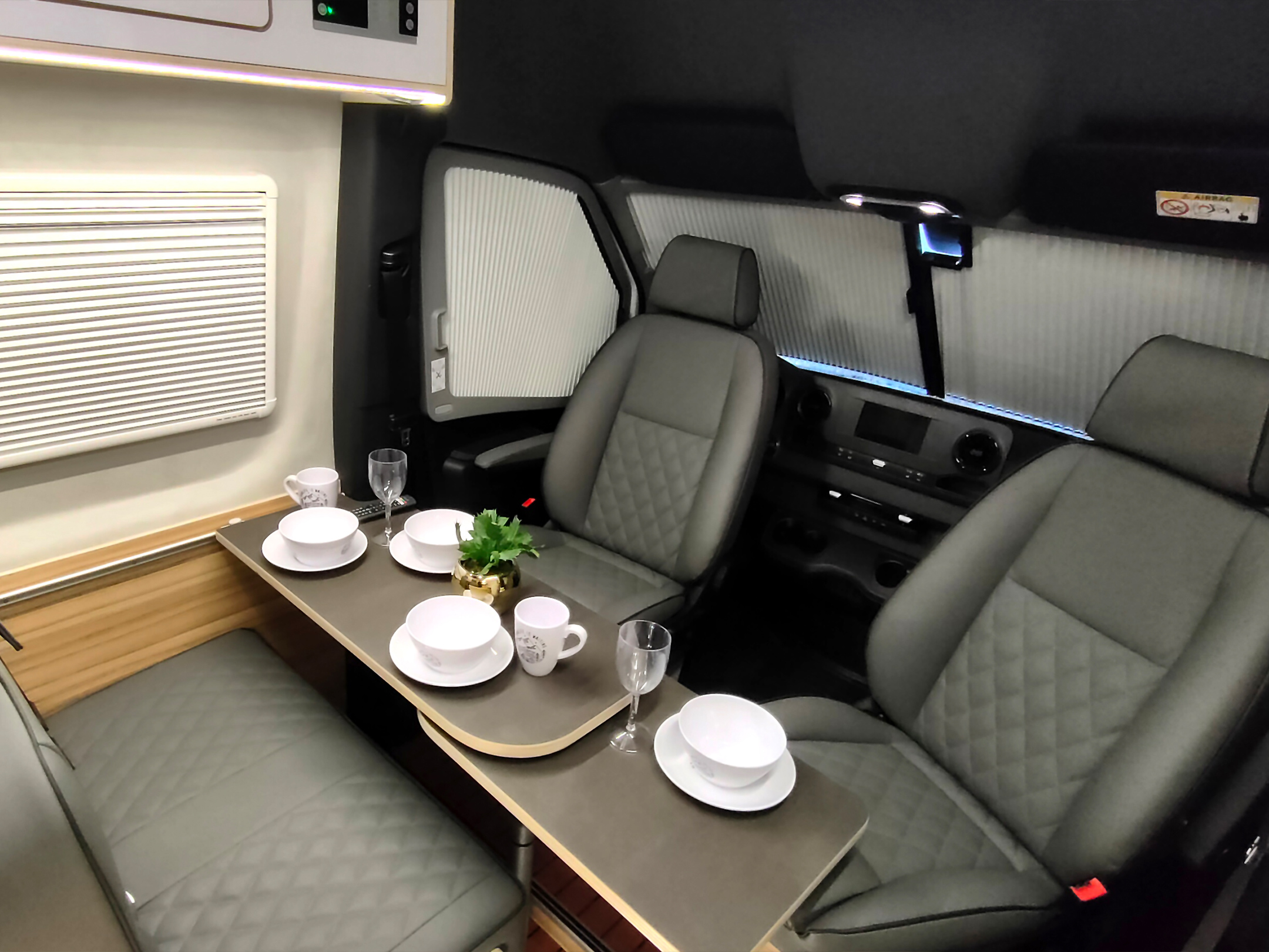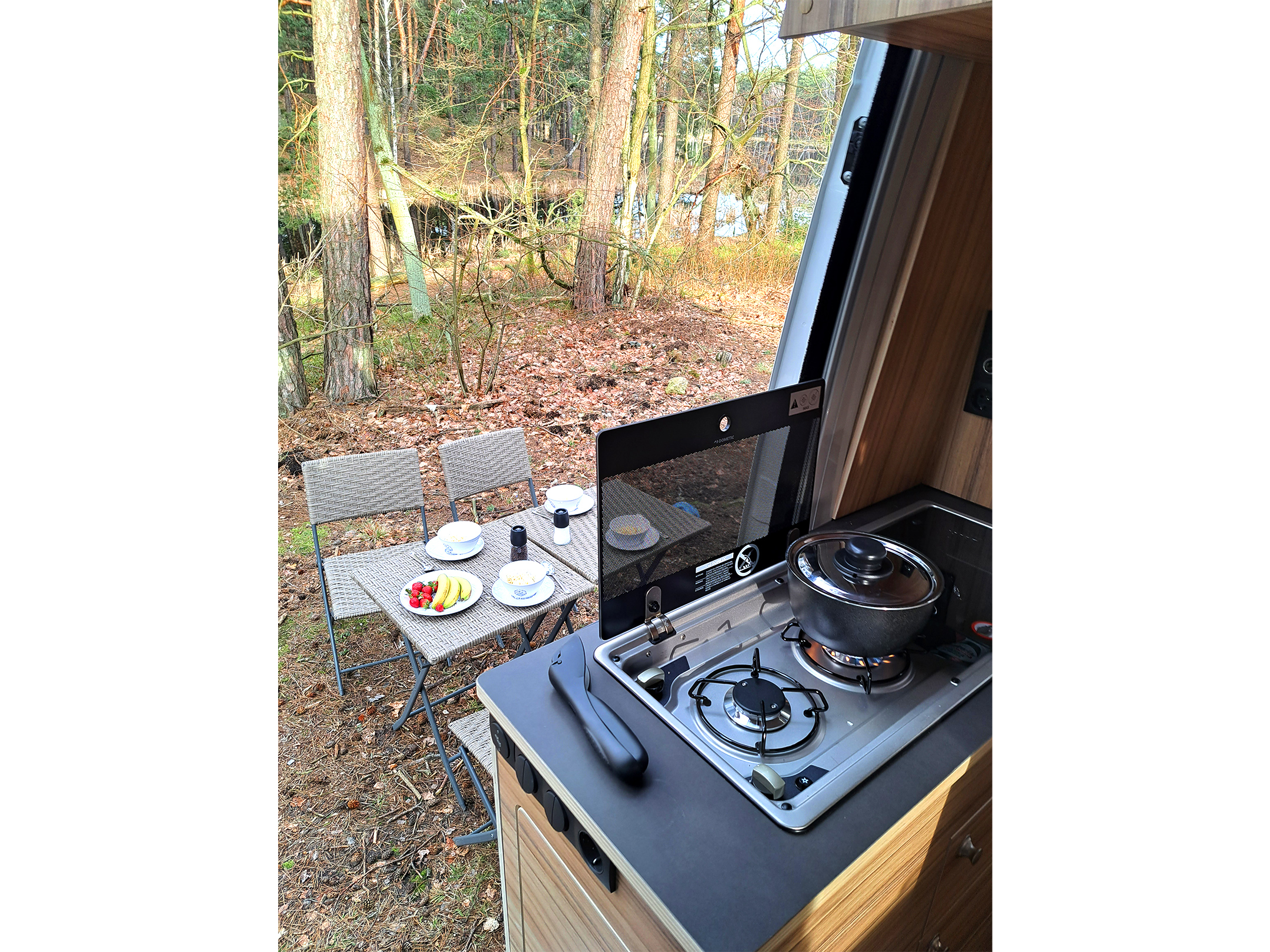 Obracane przednie fotele pozwalają na wygodne spożywanie posiłków w jadalni, natomiast szeroka markiza na zewnątrz wraz z rozkładanym stołem i krzesłami pozwala na swobodne biesiadowanie na świeżym powietrzu.
