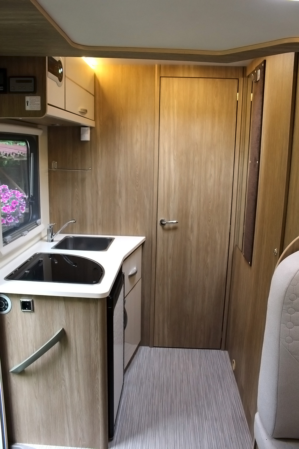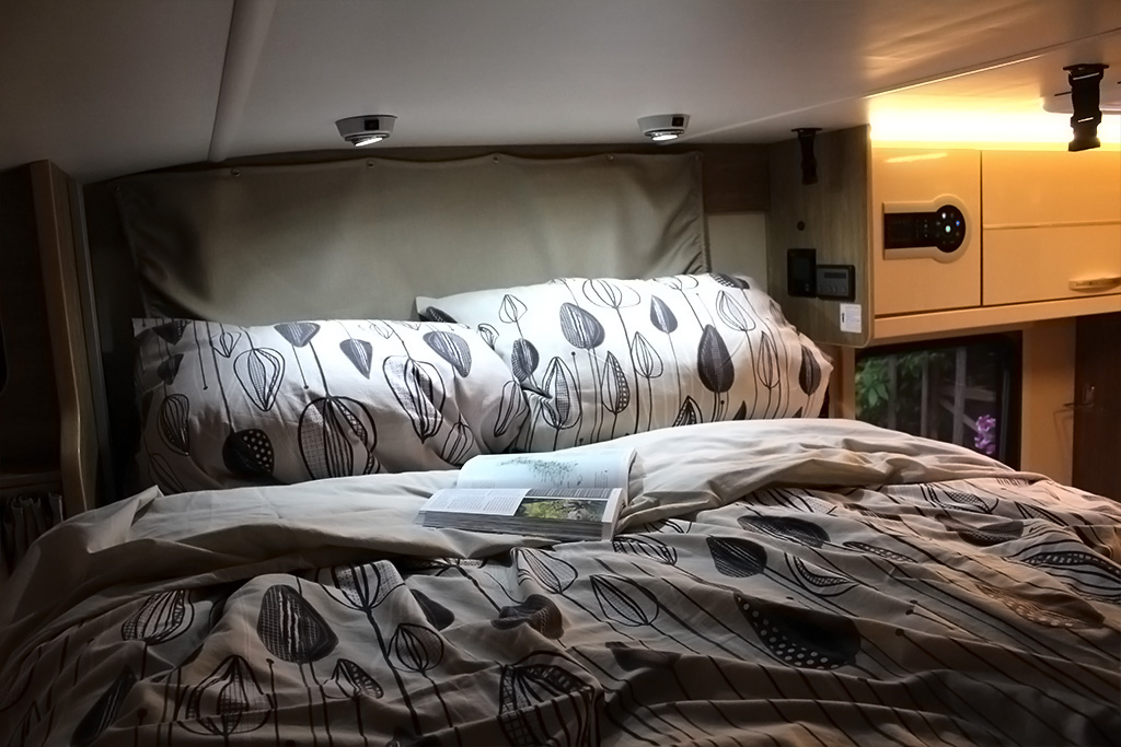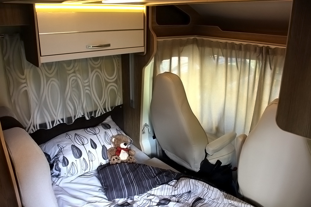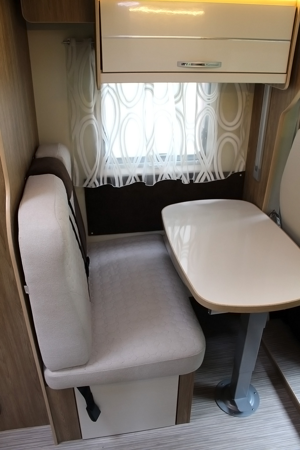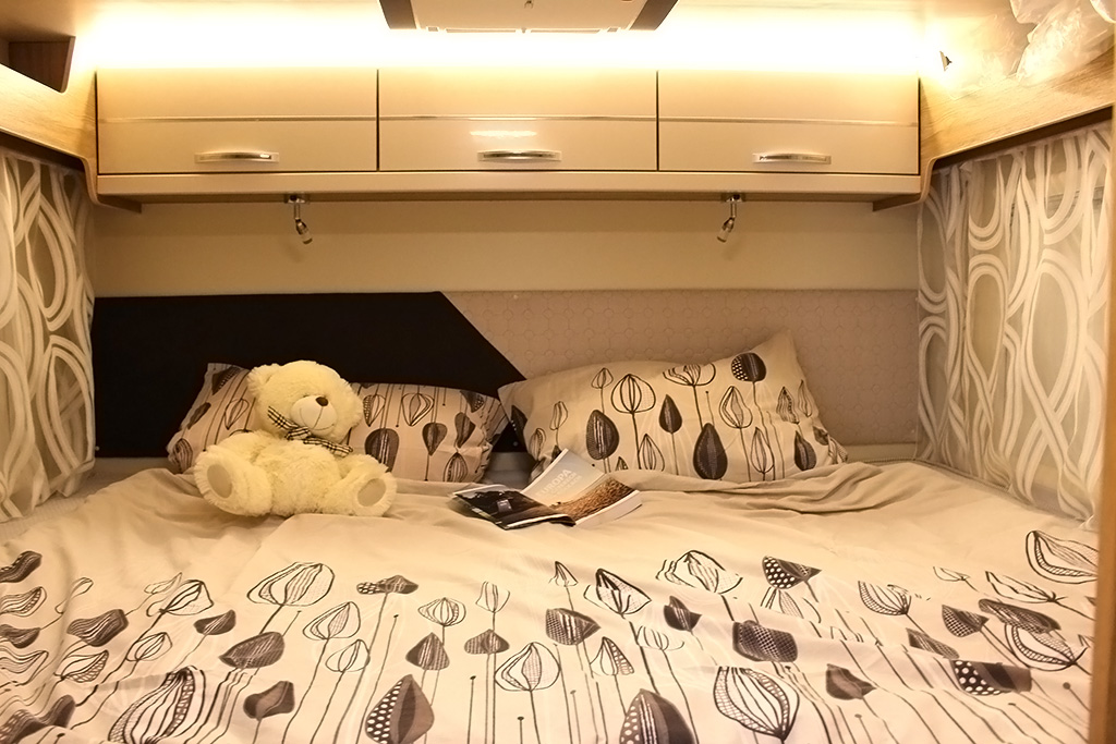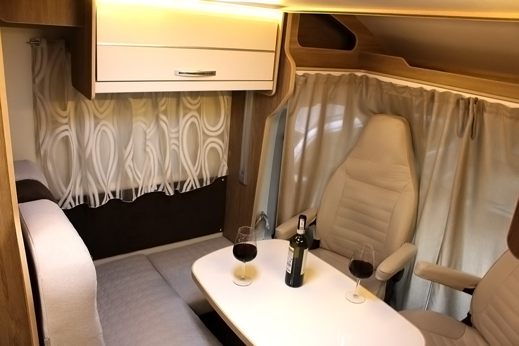 Przemyślany rozkład wnętrza tworzy dwie strefy noclegowe, oddzielone drzwiami (a nie prowizoryczną zasłonką), co daje poczucie niezależności i prywatności. Obracane przednie fotele pozwalają na wygodne spożywanie posiłków w jadalni, natomiast szeroka markiza na zewnątrz wraz z rozkładanym stołem i krzesłami pozwala na swobodne biesiadowanie na świeżym powietrzu.