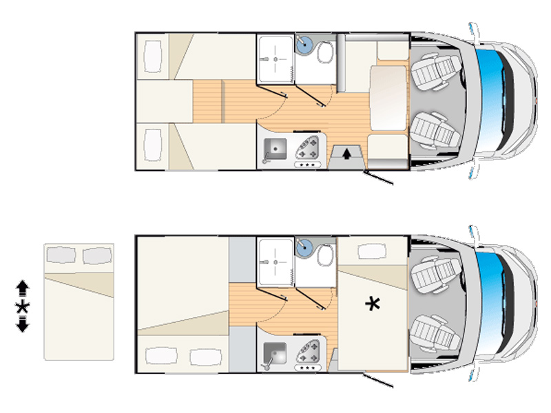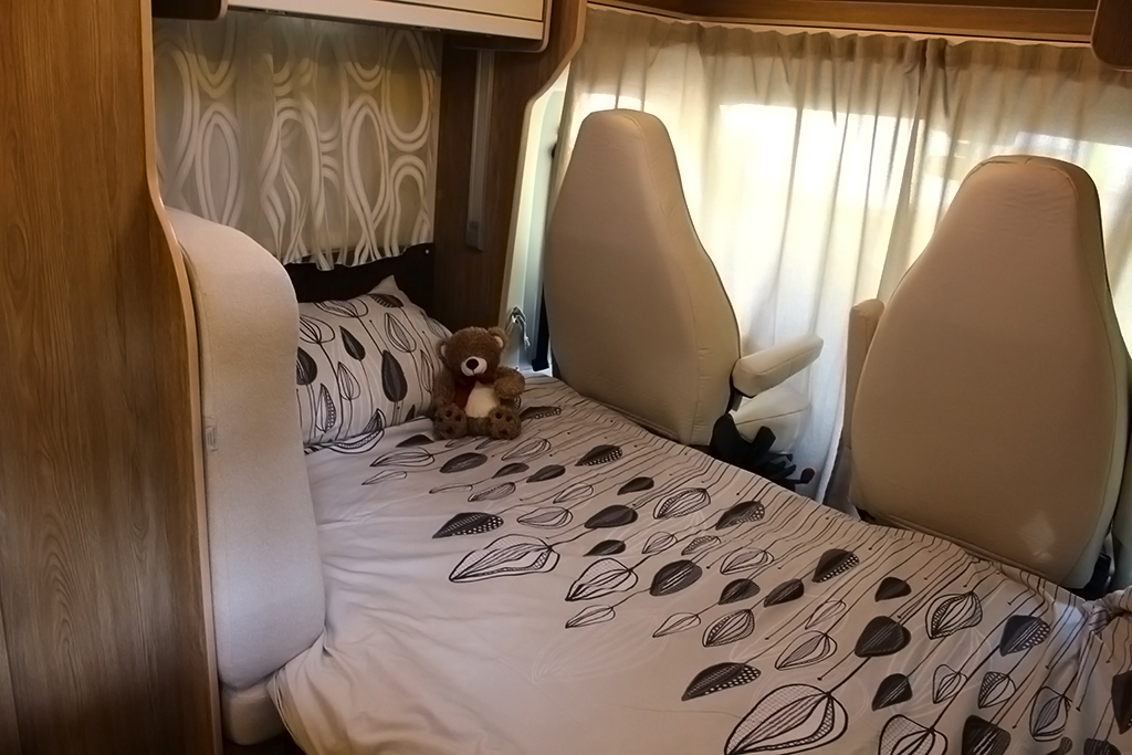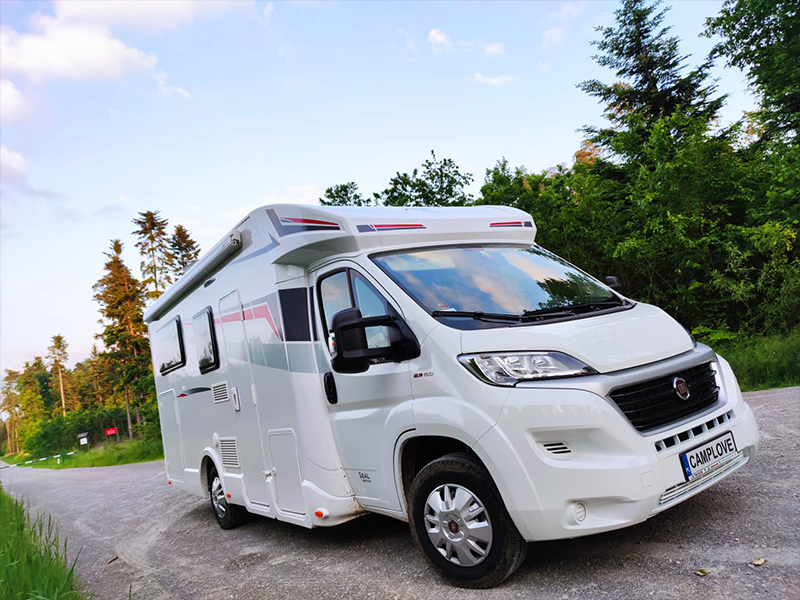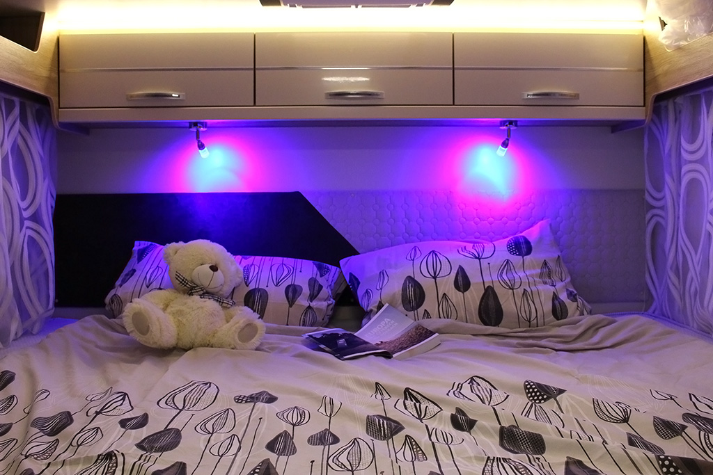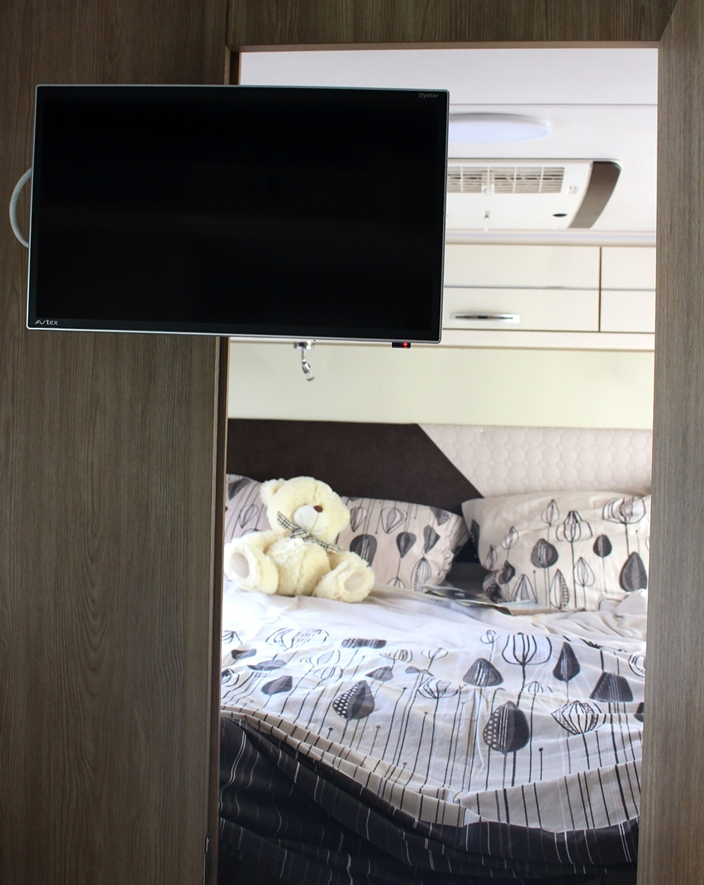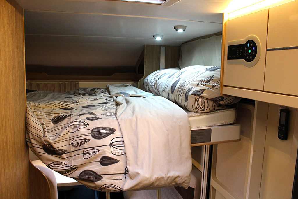 Przemyślany rozkład wnętrza tworzy dwie strefy noclegowe, oddzielone drzwiami (a nie prowizoryczną zasłonką), co daje poczucie niezależności i prywatności. Obracane przednie fotele pozwalają na wygodne spożywanie posiłków w jadalni, natomiast szeroka markiza na zewnątrz wraz z rozkładanym stołem i krzesłami pozwala na swobodne biesiadowanie na świeżym powietrzu.