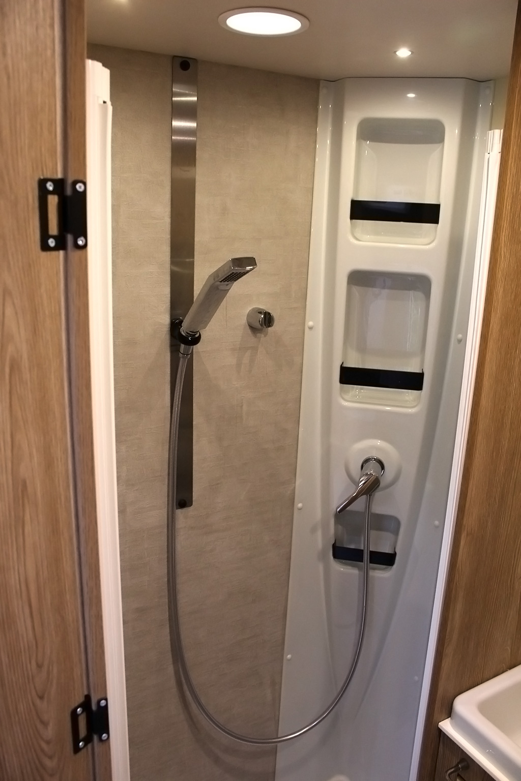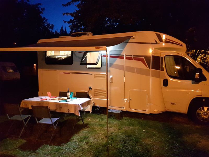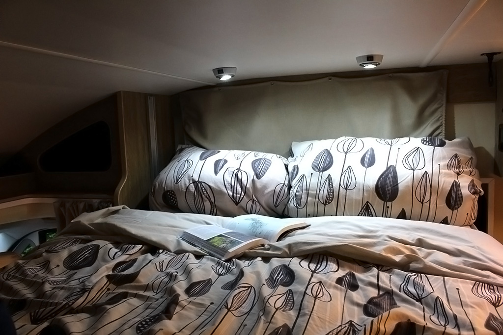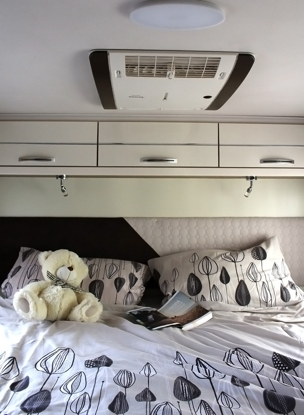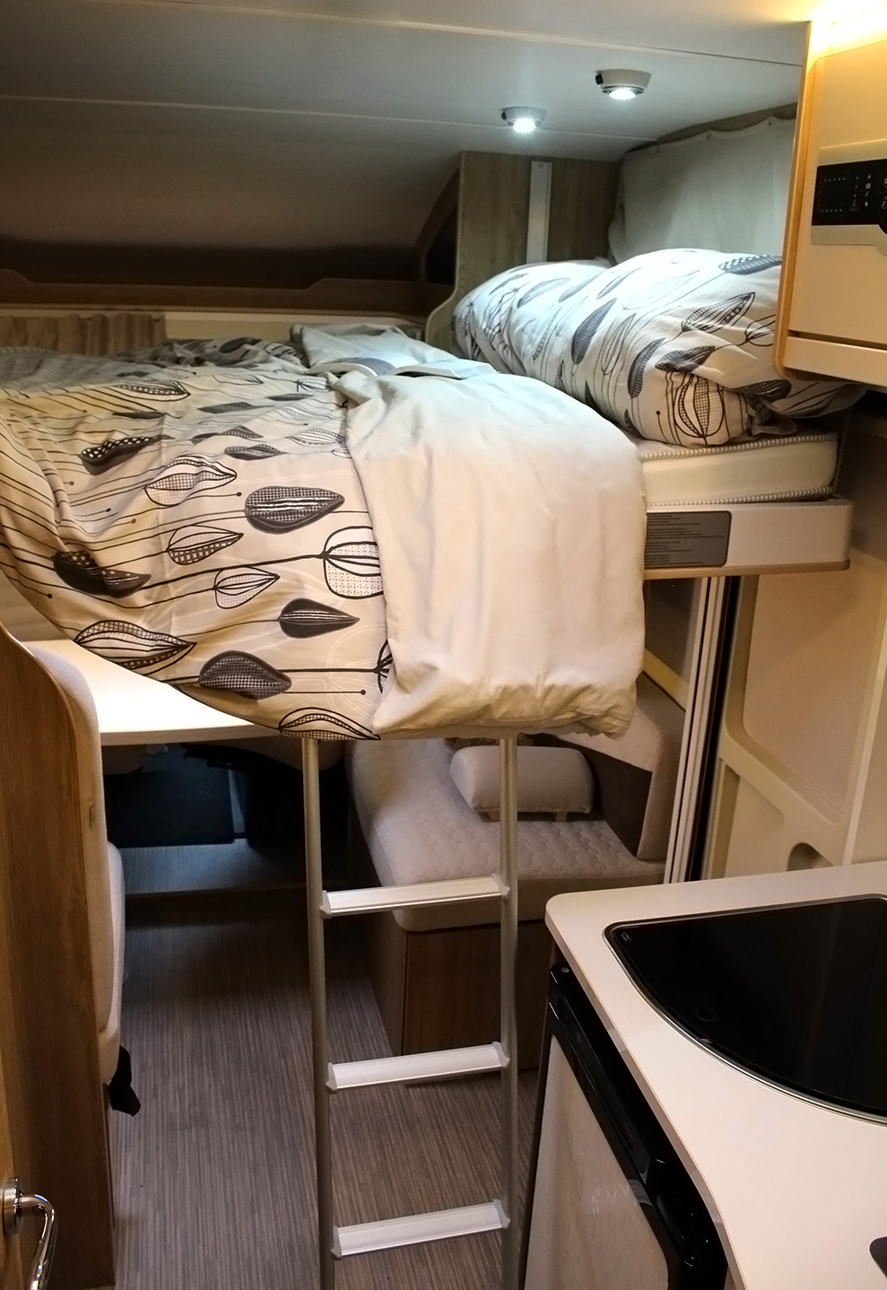 Przemyślany rozkład wnętrza tworzy dwie strefy noclegowe, oddzielone drzwiami (a nie prowizoryczną zasłonką), co daje poczucie niezależności i prywatności. Obracane przednie fotele pozwalają na wygodne spożywanie posiłków w jadalni, natomiast szeroka markiza na zewnątrz wraz z rozkładanym stołem i krzesłami pozwala na swobodne biesiadowanie na świeżym powietrzu.